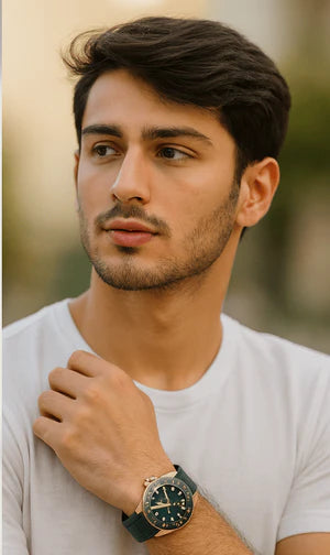 💡 مينا أخضر مزخرف – عقارب ومؤشرات مضيئة لوضوح ممتاز في جميع الظروف.